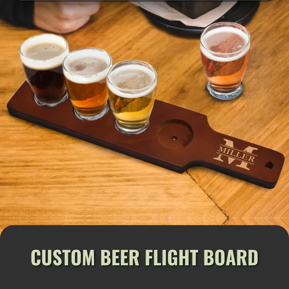 Experience the ultimate tasting with our custom beer flight board and glasses. Impress your friends with a fun and unique way to sample craft beers. Personalize your board with a choice of 2 designs. Get ready to elevate your beer tasting game!
