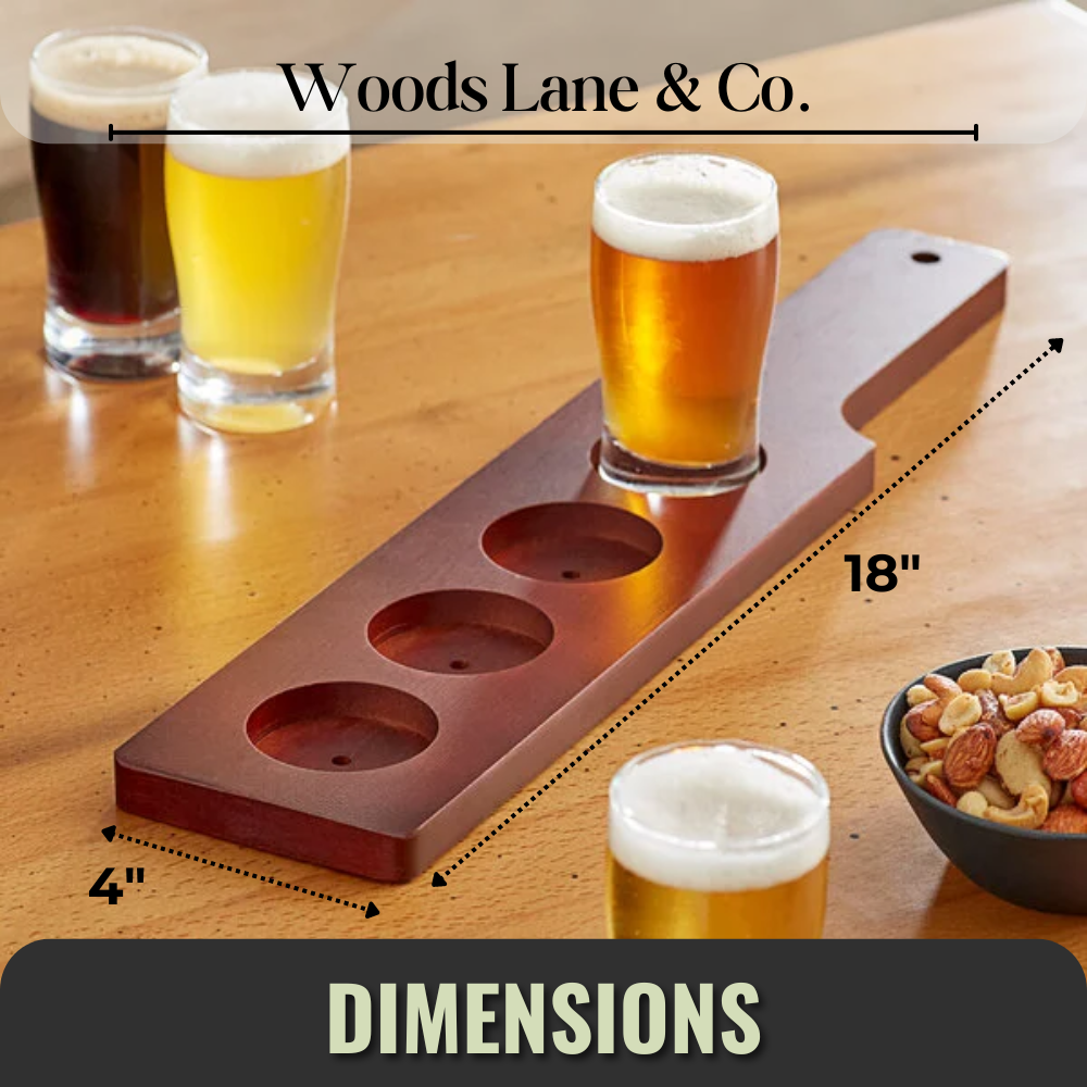 This beer flight board measures approximately 4" wide by 18" long and includes (4) 5oz. tasting glasses. Please allow 10 days for your custom engraved board to be ready.