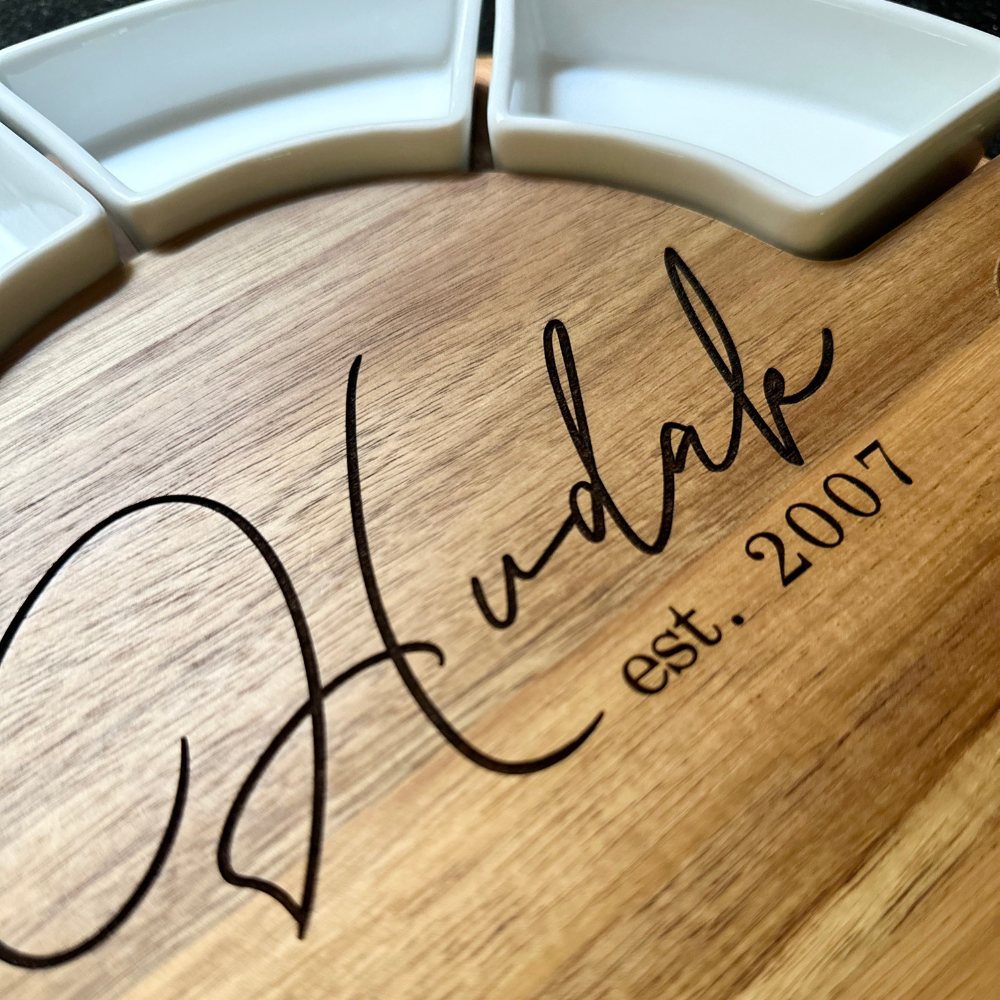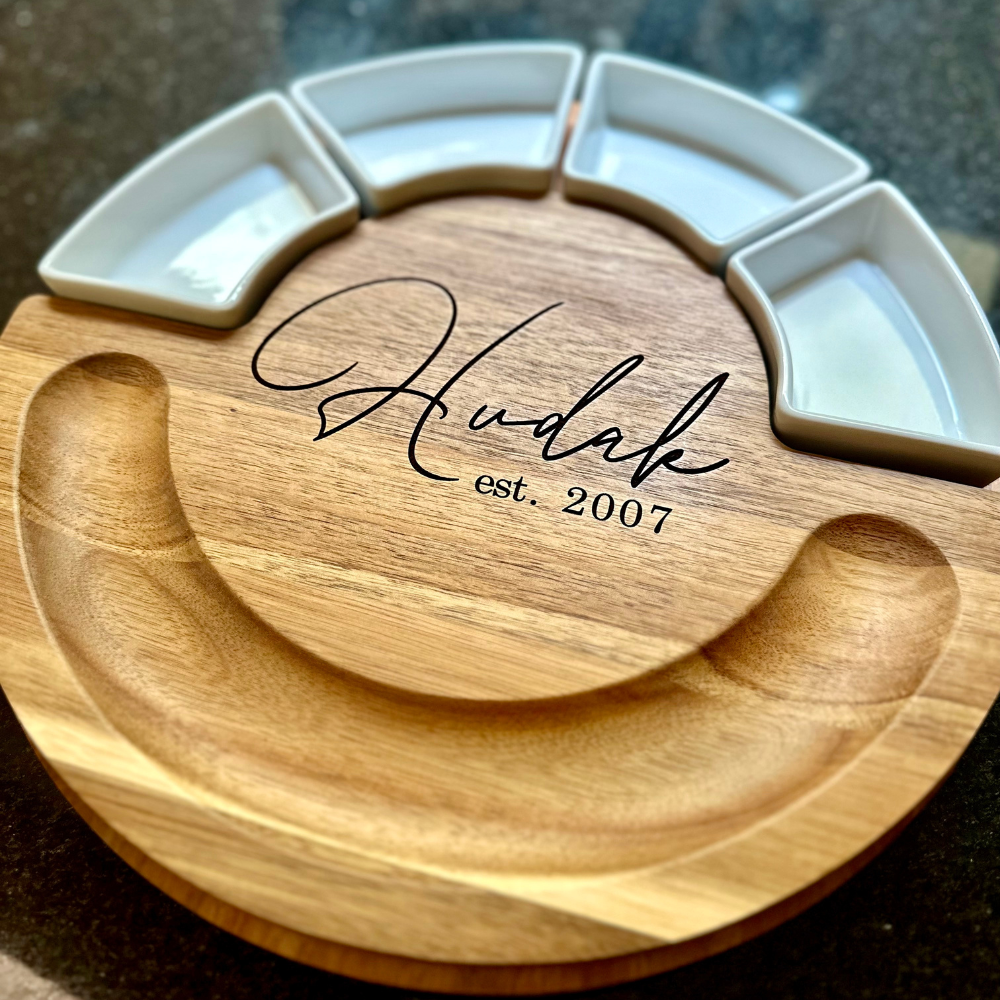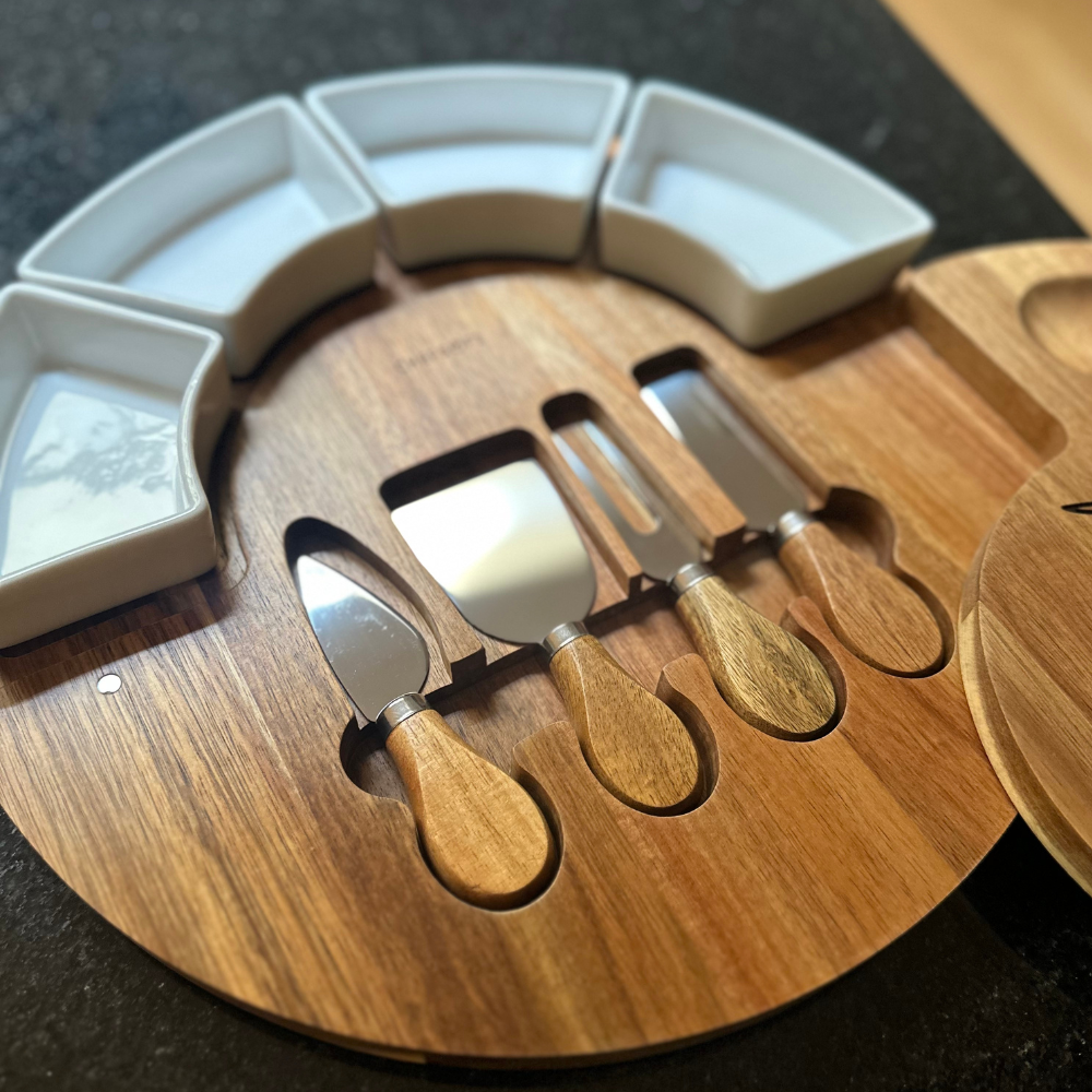 This gorgeous acacia cheese board will be the hit of your next get together! It includes 4 white bowls, 4 knives, and measures approximately 13" in diameter. The top layer slides away to reveal a convenient compartment with 4 cheese knives.
