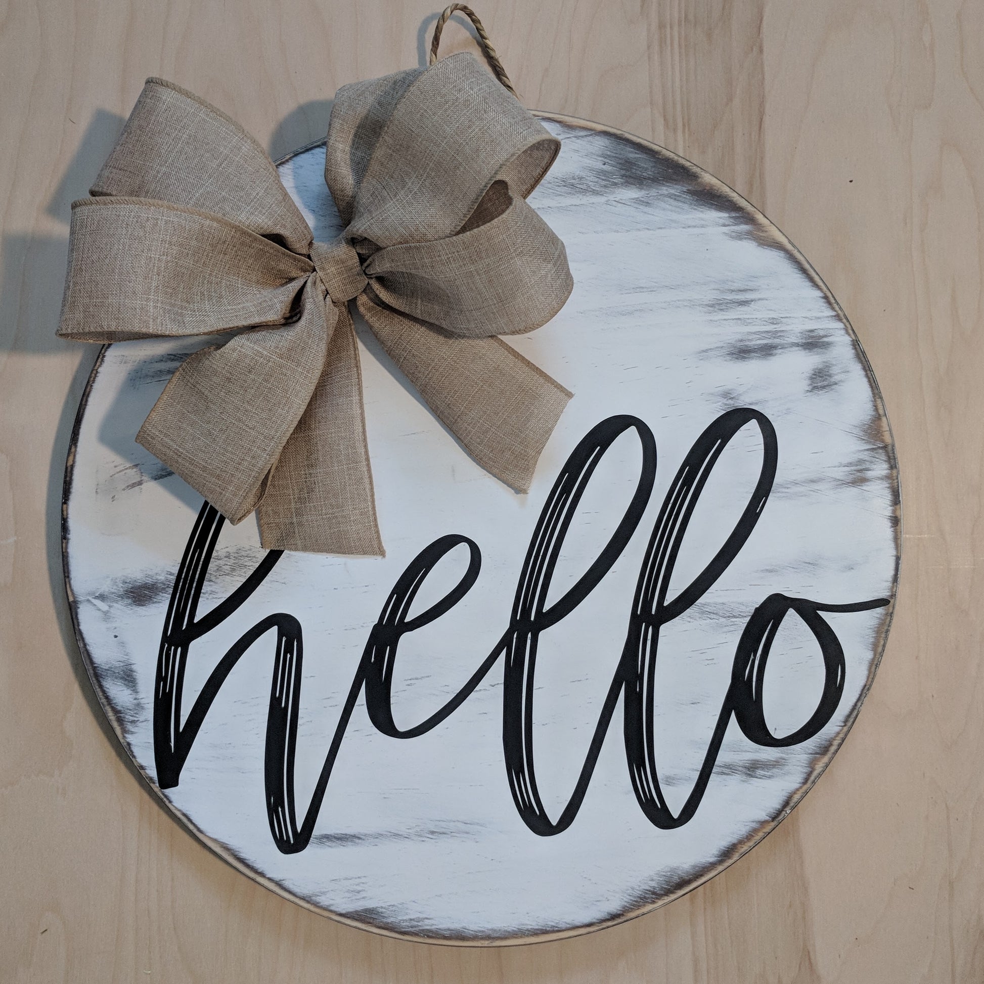 This door hanger will be completed using a stencil and painting laser cut elements of the sign. Customize with any color combination the painter chooses! Door hanger measures approximately 18" round.